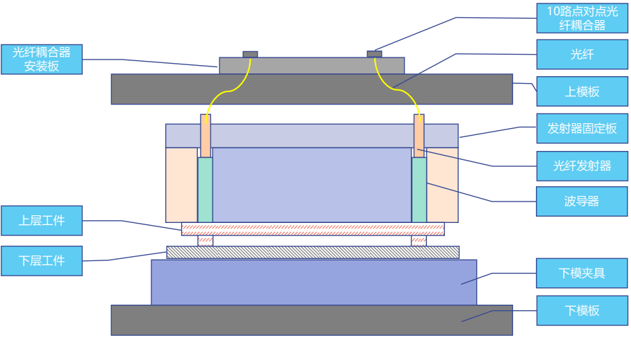 上模置顶的点对点光纤耦合器,上模在与设备连接时被自动接插,实现了快速换模。