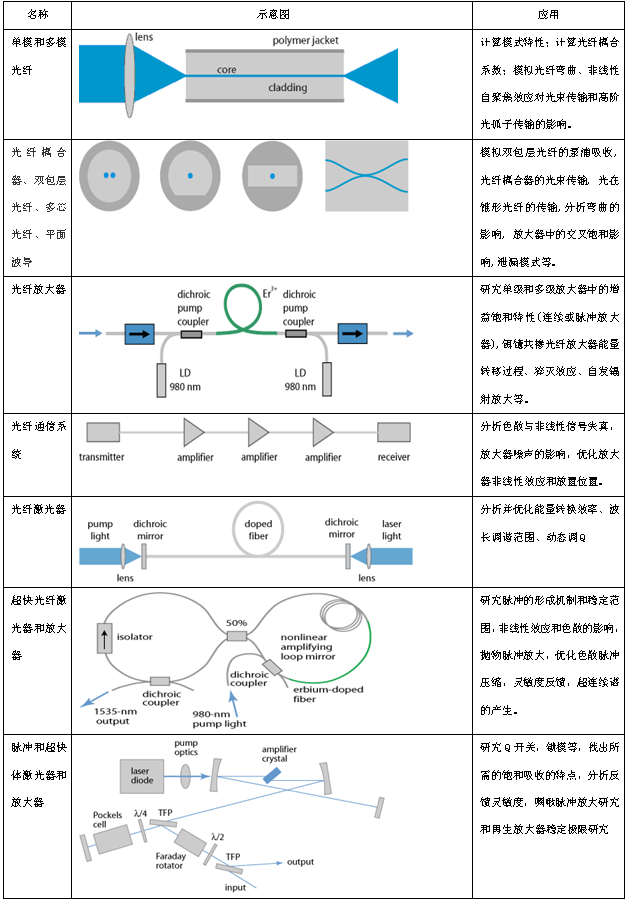 可以设计并优化光纤激光器和放大器、光波导激光器、光纤耦合器、多芯光纤、螺旋芯光纤、锥形光纤;也可以模拟超短脉冲在不同光纤设备中的传输,例如在光纤放大器系统、锁模光纤激光器和通讯系统中的传输。