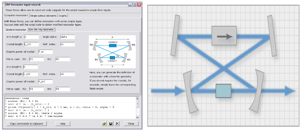 直线腔和环形腔也可以和从激光谐振腔里输出的光束一样被当作单程传播来处理。对于环形腔,光束的路径可以自动闭合,也就是说,第一个和最后一个镜子的取向及它们之间的路径长度可以自动计算。由此产生的设置可以图形化地显示,以立即识别可能的错误输入。