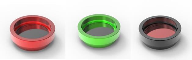 单独滤光片有六种版本,OD1滤光片装在红色外壳中,可见光透射率为~10%,OD2滤光片装在绿色外壳中,透射率为~1%, OD3滤光片装在黑色外壳中,透射率为~0.1%。单独滤光片使用了通用C口连接,可以彼此串联迭加。在外壳中安装时,它们有一个小楔角,以防造成干扰效应。