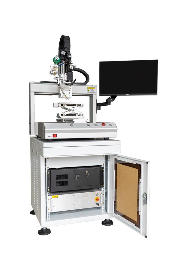 桌面式温度反馈激光焊锡系统由多轴机器人,温度反馈系统,CCD同轴定位系统以及半导体激光器系统所构成,该系统所具备的温度反馈和CCD同轴定位功能,能够有效的保证焊接点的恒温焊接,能有效的保证精密部件的精准对位,保证量产中的有效良率。