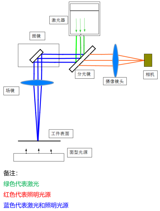 ①、工件表面上的特征信息依次经过场镜、振镜,并透过分光镜,经过摄像镜头成实像至相机上;