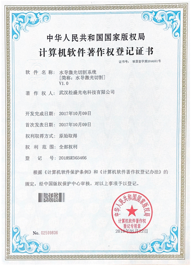 水导激光切割系统V1.0证书